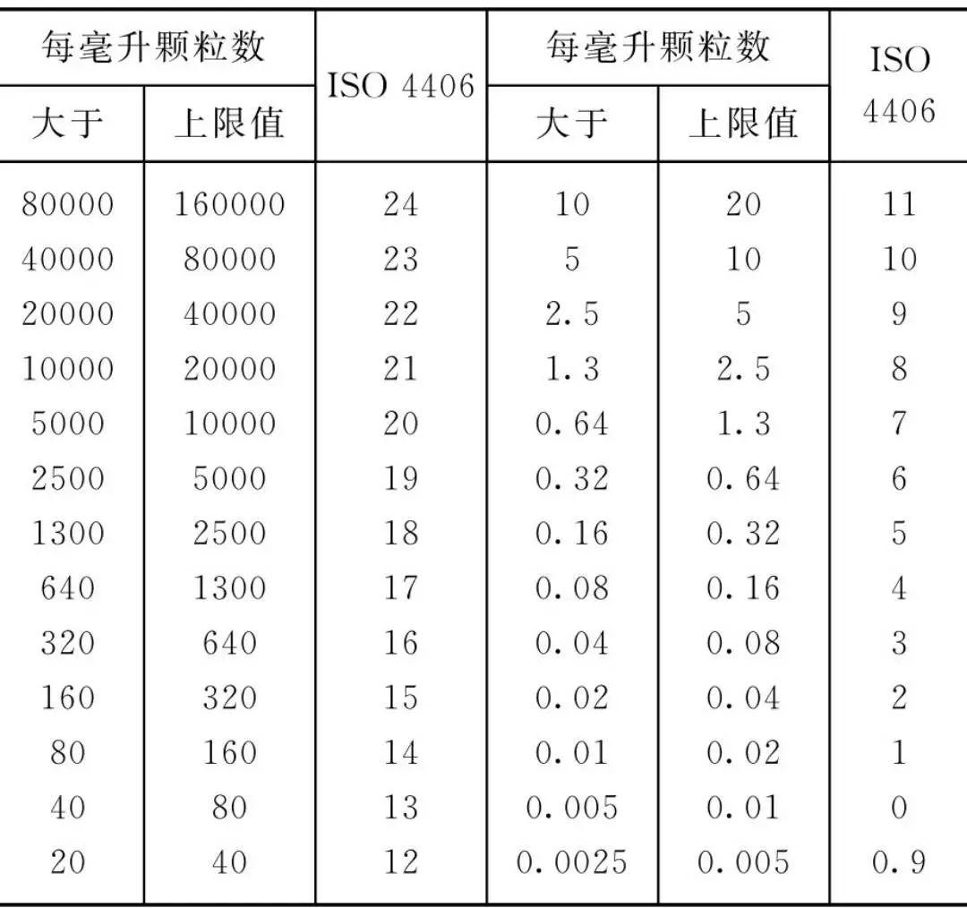 ISO 4406污染度等級(jí)和相應(yīng)的顆粒濃度。根據(jù)顆粒濃度的大小共分26個(gè)等級(jí),如表2所示。