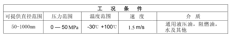 可提供直徑范圍壓力范圍溫度范圍速度介質(zhì)50-100mm0-50Mpa-30℃+100℃1.5m/s通用液壓油,阻燃油,水及其他