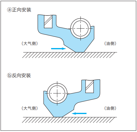 ?是正向安裝時(shí)油的密封狀態(tài),也就是 大氣被送入油側(cè)的狀態(tài),?是反向安裝時(shí)油向大氣側(cè)泄漏的狀態(tài)。