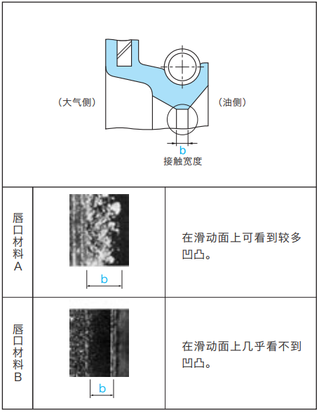 所示為唇口材料不同時(shí)的滑動(dòng)面狀態(tài),我們 可以看到唇口材料 A 比唇口材料 B 在滑動(dòng)面上形成的凹凸更多。