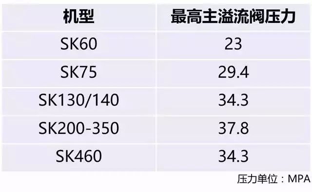 ▊主溢流閥壓力是否正常,可以使用壓力計測定主溢流閥的調(diào)定壓力,以下是神鋼系列機(jī)型主溢流閥壓力的最高壓力值: