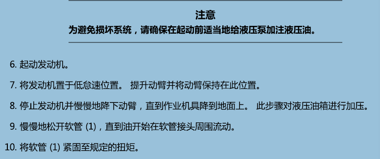 完成主泵維修或液壓油更換后,請(qǐng)排除液壓系統(tǒng)中的空氣。 用下述方式可以排除: