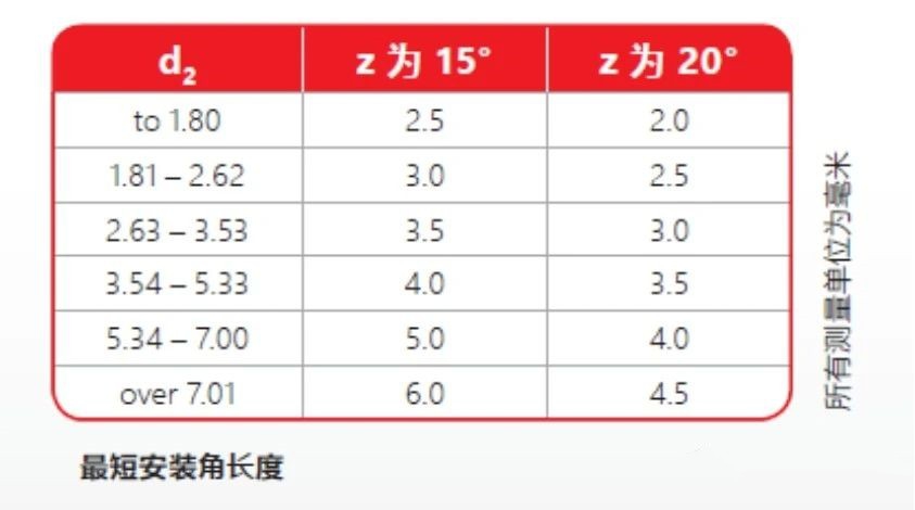不同線徑d2條件下的活塞和活塞桿密封允許的最短安裝角長度。