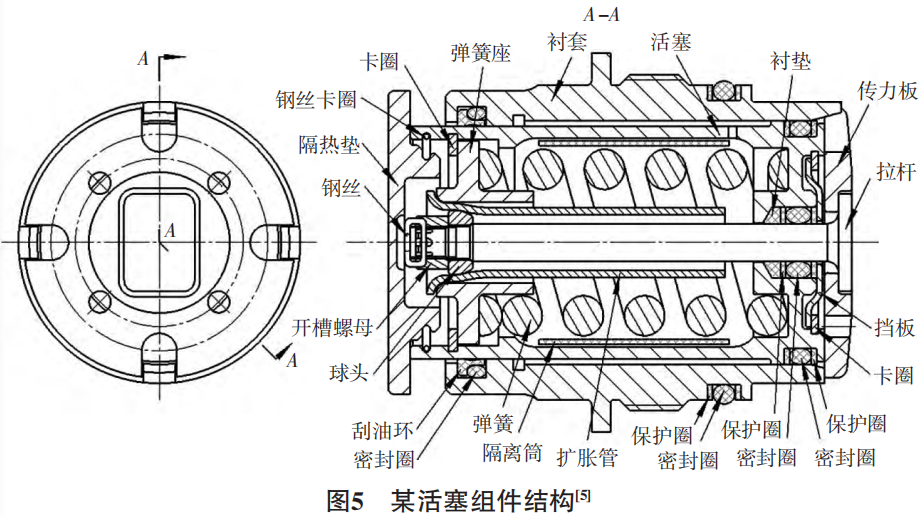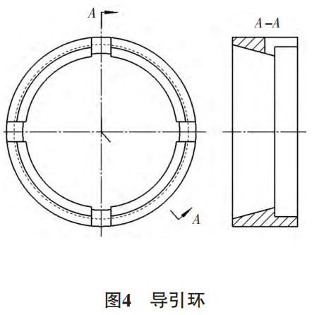 用于密封圈理順的挑針、套于螺紋上防止螺紋劃傷 密封圈的導(dǎo)套和保護(hù)圈校正的校正棒、收壓板、收壓套等 都屬密封件安裝的常用工裝,除此之外,一些設(shè)計上因結(jié) 構(gòu)受限而無法處理的槽或孔必須借助工裝來進(jìn)行彌補(bǔ), 否則密封圈的損傷無法消解。圖4所示為圖5某活塞組件結(jié)構(gòu)的輔助工裝實例,從中可以看出,如果不使用導(dǎo)引環(huán) 對襯套右端為了傳力板角向定位而銑掉的部分進(jìn)行補(bǔ) 形,在活塞壓入襯套時,必然會成為活塞上的密封圈在該 位置鼓出的誘因,所以該活塞組件的傳力板、拉桿應(yīng)選在活塞壓入襯套之后安裝。同理,對閥套上不能開環(huán)形凹槽 過渡處理的交叉孔,也可以使用工藝柱銷進(jìn)行補(bǔ)形。