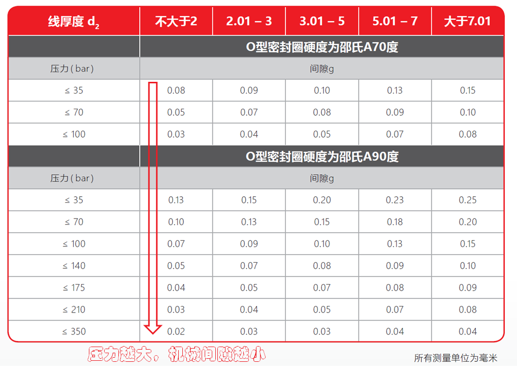 線徑、所受壓力、機械間隙、硬度四者之間的關系表,可供設計時參考。粗略的看,總的設計原則就是——壓力越大,機械間隙就要越小。