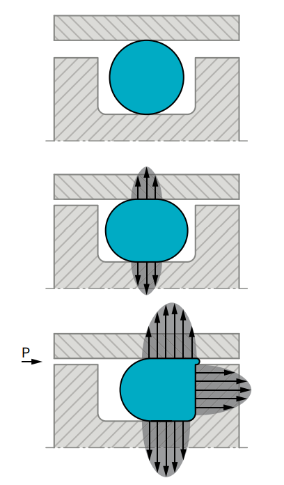O形圈是一種雙向密封元件。安裝時,O形圈徑向或軸向的初始壓縮量決定了O形圈的初始密封能力。系統(tǒng)壓力作用于O形圈所 產(chǎn)生的力,就是其總的密封力;該密封力隨著系統(tǒng)壓力的升高 而增大。在壓力作用下,O形圈的形狀和具有高表面張力的液體相仿,壓力朝各個方向等值傳遞。