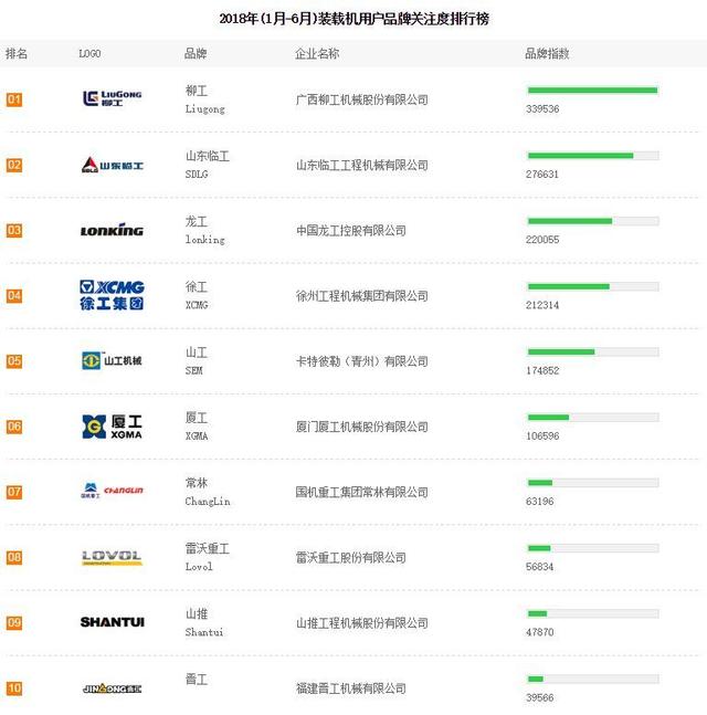 通過上半年裝載機用戶對品牌的關注排名榜看,以柳工、臨工、龍工三大工第一梯隊的鐵三角陣營沒有發(fā)生改變,依然占據(jù)裝載機品牌關注榜前三,通過用戶關注度也在一定程度上反映出品牌的銷售情況。(如下品牌關注度僅供參考)