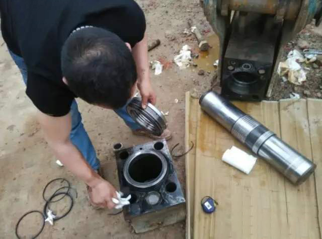 用衛(wèi)生紙擦干凈把油封按順序裝好,內(nèi)油封壞的沒壞的全部換掉,包括氮氣殼上的和控制活塞頻率閥上的。內(nèi)外油封裝好后把打磨好的活塞裝上。