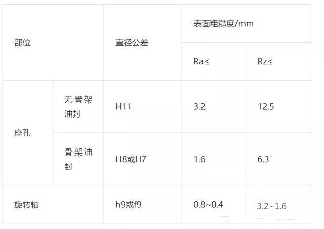 1、表面粗糙度,由于軸的速度與油量不同,一般軸的粗糙度過(guò)大或過(guò)小,都會(huì)影響到油封的泄漏與磨損。軸的表面粗糙度容許范圍為Rz1.0~5.0μm ;Ra0.2~0.8μm。對(duì)旋轉(zhuǎn)軸用油封,取2.5~1.6μmRz。