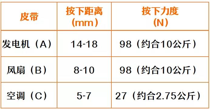 檢查發(fā)動(dòng)機(jī)皮帶松緊度,首先關(guān)閉發(fā)動(dòng)機(jī),然后用大拇指按下皮帶的中部,其距離如果在以下表范圍內(nèi)則屬正常(1N=0.102KG)。張力不足時(shí),皮帶易打滑。張力過大時(shí),易損傷各軸承。