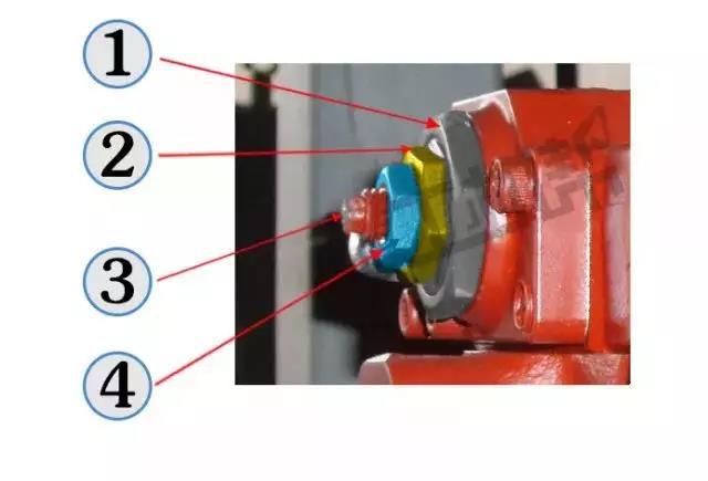 調(diào)整步驟:①用開口扳手松開4(藍(lán)色);② 用開口扳手向里(憋車時向外)微調(diào)3(紅色,每次按15度左右)調(diào)節(jié)至正常;③擰緊鎖緊螺母4(藍(lán)色)。