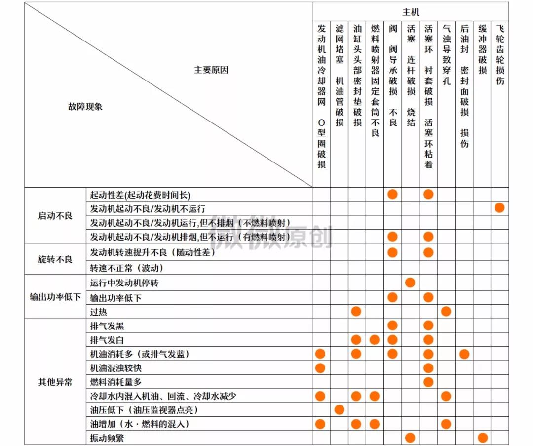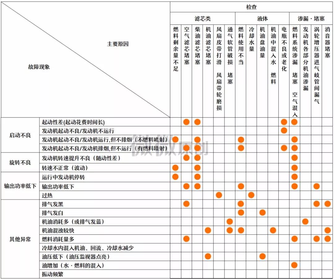 其他異常:排氣發(fā)黑 ;排氣發(fā)白 ;機油消耗多(或排氣發(fā)藍(lán)) ;機油混濁較快 ;燃料消耗量多 ;冷卻水內(nèi)混入機油、回流、冷卻水減少 ;油壓低下(油壓監(jiān)視器點亮) ;油增加(水?燃料的混入) ;振動頻繁