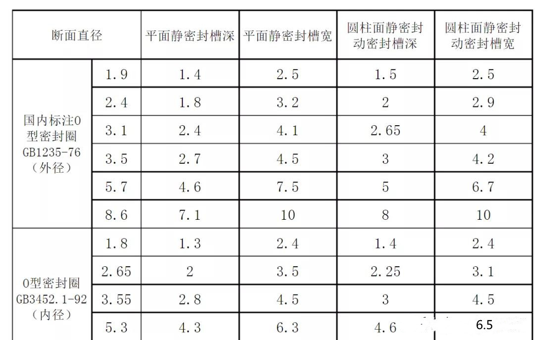 該尺寸表可稍作解釋一下,左側第一欄為O型密封圈公稱直徑的為外徑或內徑的選擇,上橫欄為動靜密封和平面密封或回轉體密封的選擇,正中欄里為與以上選擇后對應的溝槽深度和寬度尺寸。該尺寸為國家標準推薦尺寸,特殊情況時可適當結合經驗變動。
