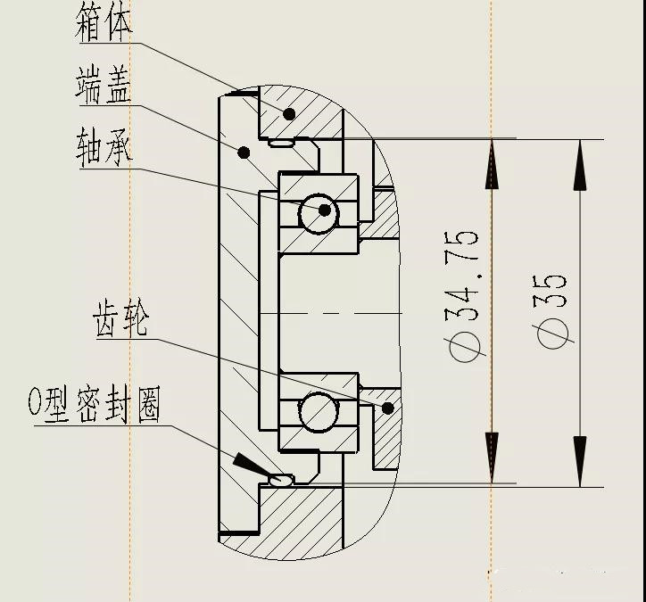 該圖中孔徑為?35,密封處為端蓋的軸徑與孔的靜密封,也不承受高壓,則可取線徑較小的密封圈,則可查表確定其規(guī)格為?35x1.9,這樣可以以此計算軸與孔的尺寸了